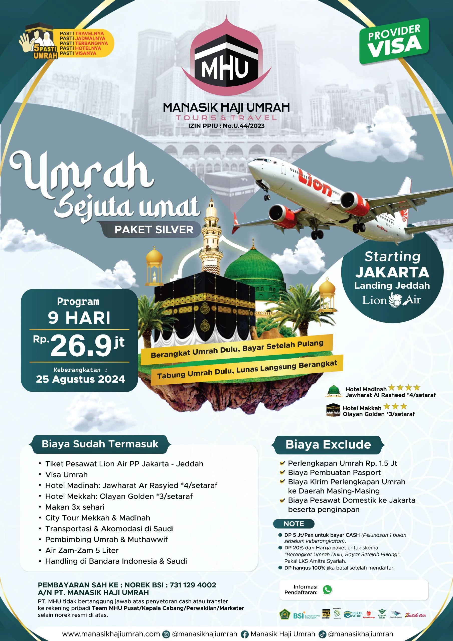Kini saatnya untuk mewujudkan impian umroh Anda dengan paket eksklusif kami yang menawarkan kenyamanan, keistimewaan, dan harga terjangkau. Dengan tanggal keberangkatan yang telah ditetapkan dan maskapai pilihan, Anda dapat memastikan perjalanan spiritual Anda berjalan lancar dan tak terlupakan.